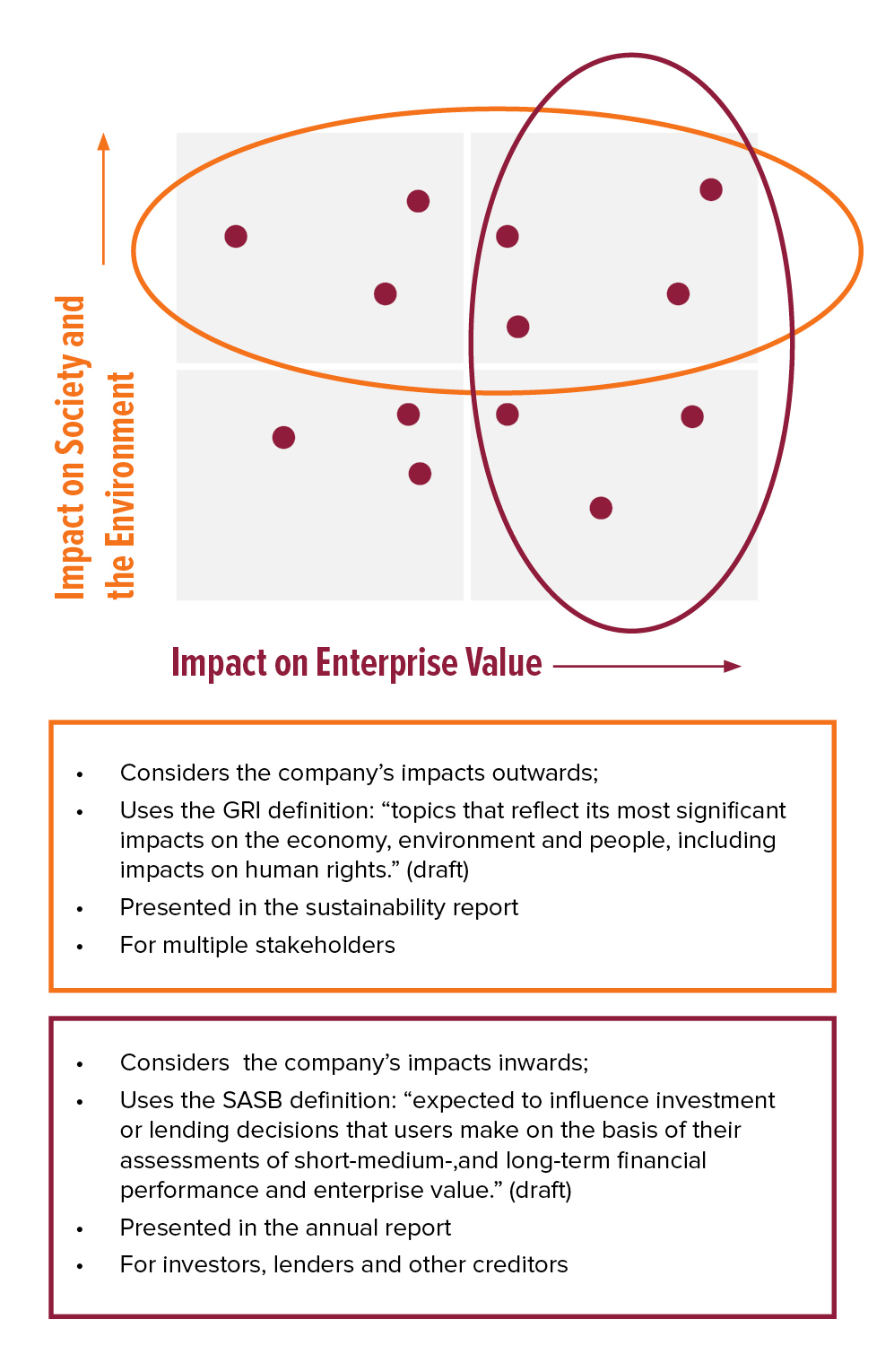 For the purposes of reporting, a business should engage its investors on topics that affect enterprise value (in the two right quadrants). The business will report to a wider range of stakeholders, such as consumers, business partners, and local communities, on significant impacts to the economy, the environment, and people (in the two top quadrants).