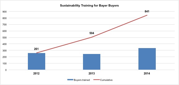 By partnering with EcoVadis and improving employee and supplier engagement on sustainability, Bayer has evolved its sustainable procurement program from a pilot initiative to what is now an integral aspect of the company’s overall sourcing program. Collaborating with EcoVadis specifically helped Bayer HealthCare improve its data collection and assessment of suppliers’ sustainability performance, nearly doubling its supplier questionnaire response rate to 81 percent in 2014 from 45 percent in 2013. Bayer also continued to expand sustainability trainings on its new supplier assessment process involving EcoVadis. Since the initial rollout in 2012, Bayer has trained more than 800 buyers across the Bayer organization.